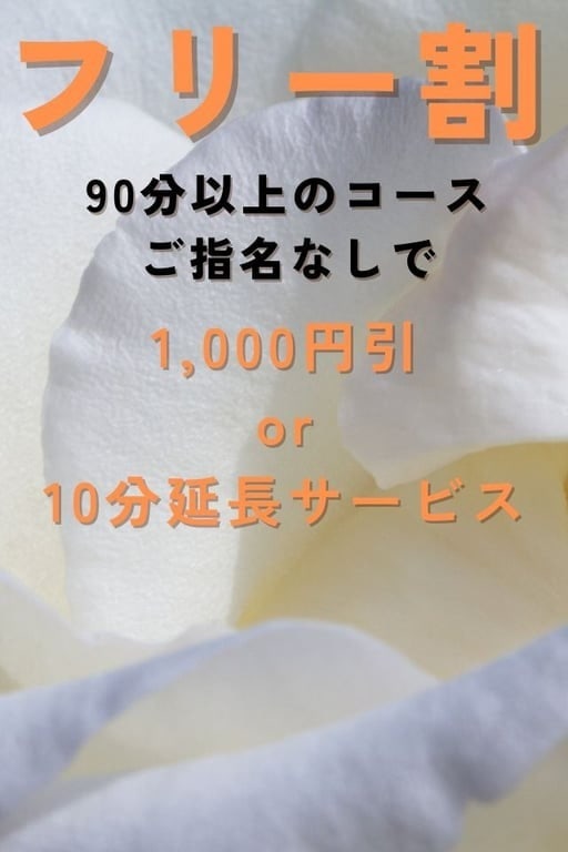 ①ご新規様 入会金無料!!! ②ご指名無し90分以上ご予約の方、1,000円引もしくは10分延長サービス!!!