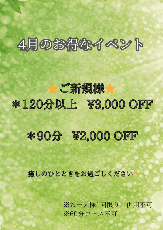 🍀4月のお得なイベント🍀 ⭐️ご新規様⭐️ ★90分コース2000円引き!! ★120分以上のコース3000円引き!! ※90分コース〜 ※お一人様1回限り ※割引併用不可 癒しのひとときをお過ごしください✨