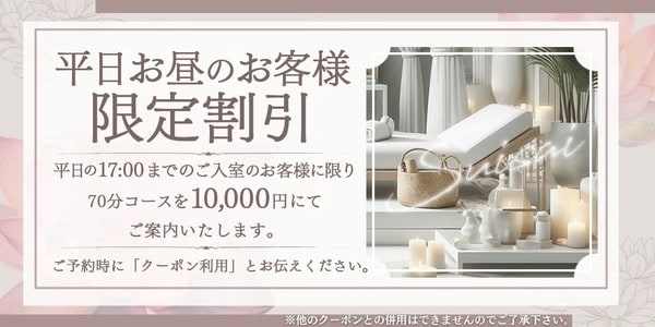 平日11:00〜17:00(17:00までのご来店)のご利用のお客様へは、リンパトリートメント70分コースを10,000円にてご案内いたします。