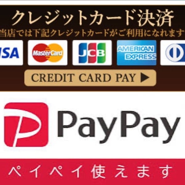 いつも当店をご利用いただきありがとうございます。 このたび、お支払い方法として クレジットカード および PayPay がご利用いただけます。 ・現金 ・クレジットカード(※決済手数料10%を別途頂戴いたします) ・PayPay(※手数料無料) ご利用シーンに合わせてお選びください。 ご不明点がございましたら、お気軽にお問い合わせください。